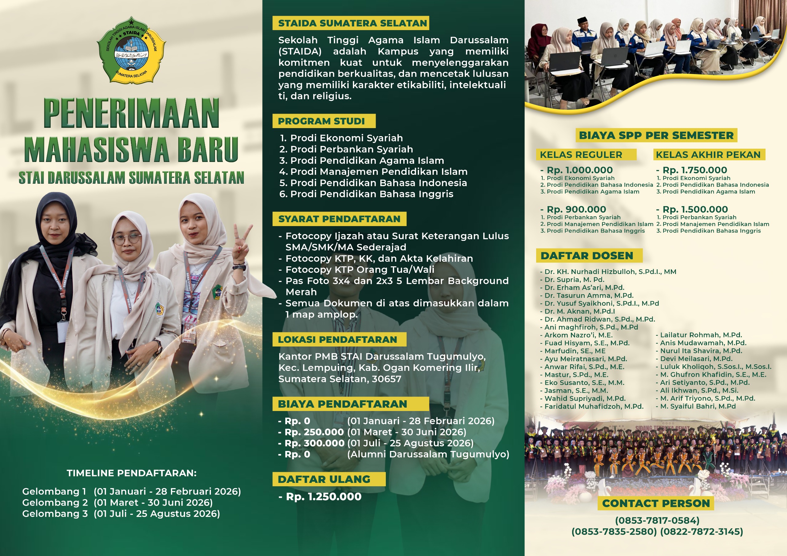 Jangan lewatkan kesempatan ini! Segera daftarkan diri Anda di gelombang pertama untuk mendapatkan pendaftaran gratis. STAIDA Sumatera Selatan siap mendampingi Anda menuju masa depan yang lebih cerah dengan ilmu dan akhlak mulia.